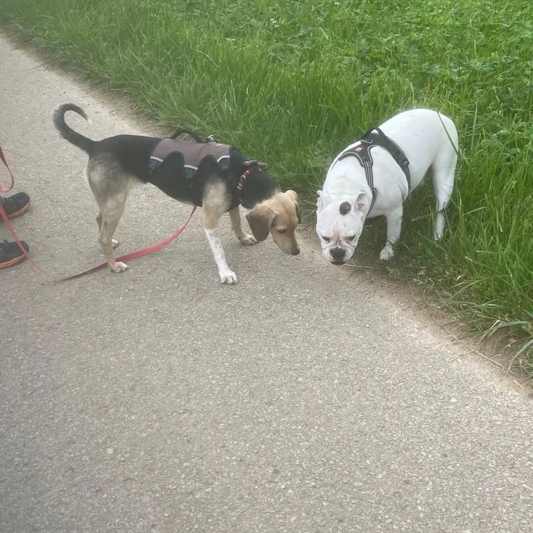 Maja & Siggi unterstützen mich im Bereich des 2-5 Dogs Coachings. Maja ist eine griechische Straßenhündin die vor knapp 4 Monaten nach Deutschland kam. Ich durfte sie vom Flughafen Düsseldorf abholen und dieses kleine, schüchterne und unsichere Wesen von Anfang an begleiten.